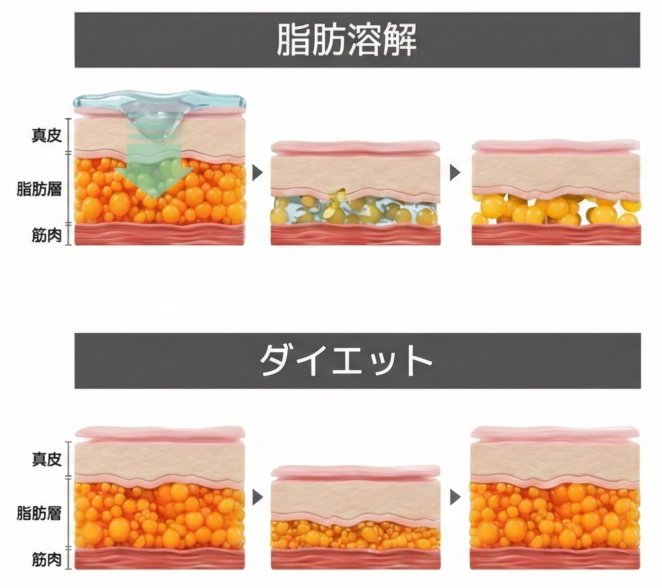 「一般的なダイエットは、一時的に脂肪細胞の中の“脂肪(中性脂肪)”を減らしているだけなので、脂肪細胞そのものの数は減らないから、食生活が戻ると、あっという間にリバウンドしてしまうのです。一方で、脂肪溶解は、脂肪細胞そのものにアプローチする発想。脂肪細胞を減らすことで、リバウンドしにくい状態を目指せるのが最大の違いです。つまり、 一般的なダイエット → 脂肪細胞はそのまま。減ったのは中身だけ。脂肪溶解ケア → 脂肪細胞自体に働きかけ、土台からスッキリ。「減らす」ではなく「根本から整える」。だから、次こそリバウンドを繰り返さないボディメイクを叶えたい人にこそ、脂肪溶解発想のケアは選ばれています。
